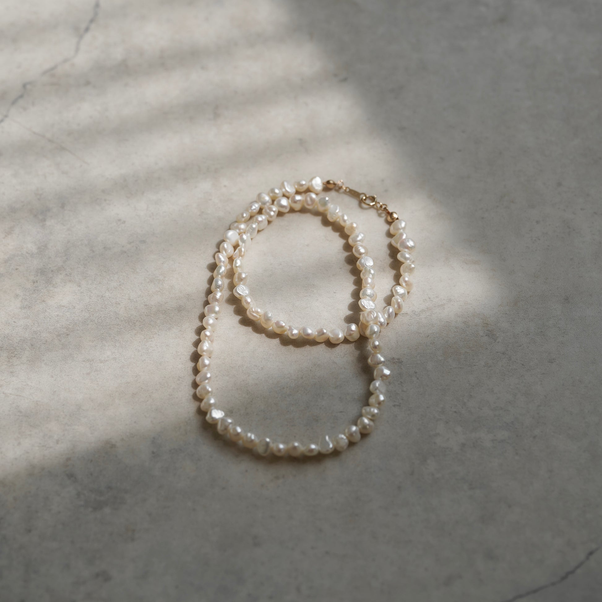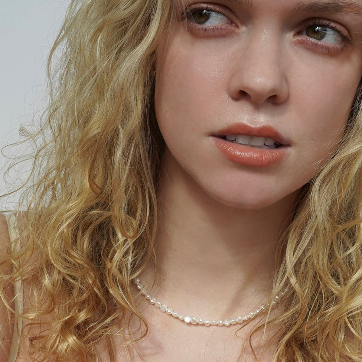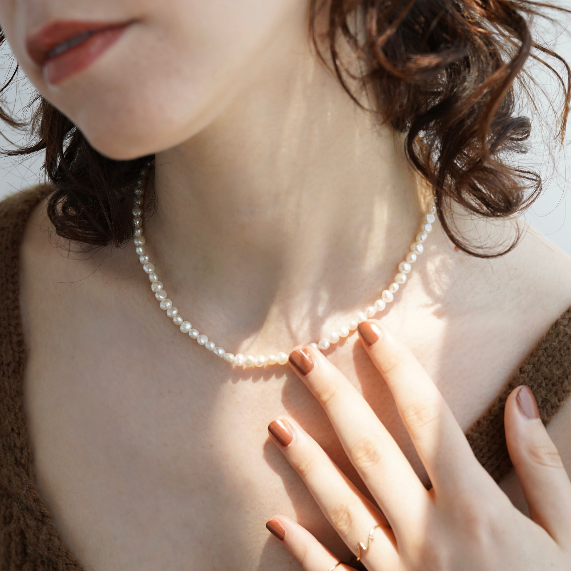 カジュアルに合わせていただけるパールネックレスを目指して、サイズ感と、1粒1粒異なる形のパールを厳選いたしました。