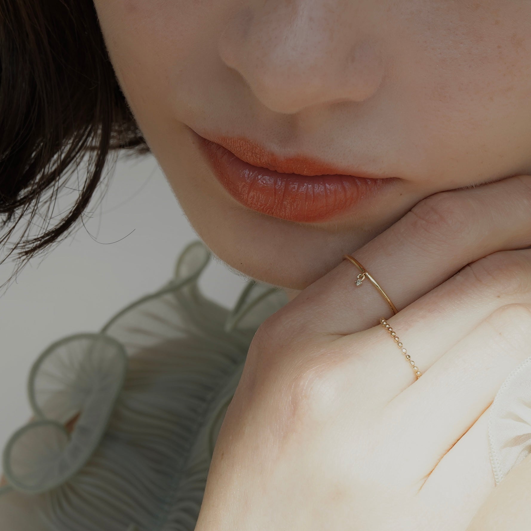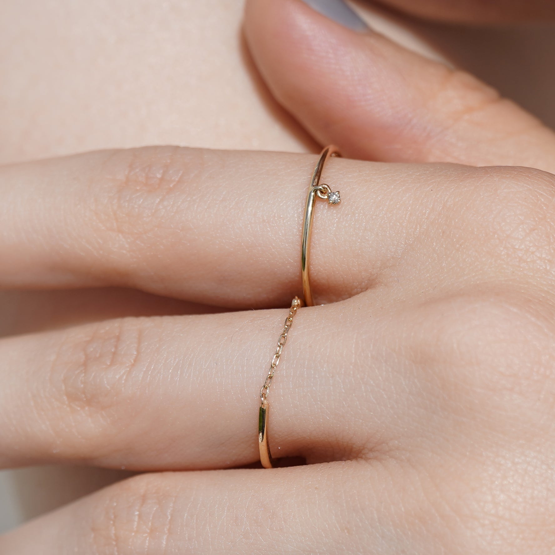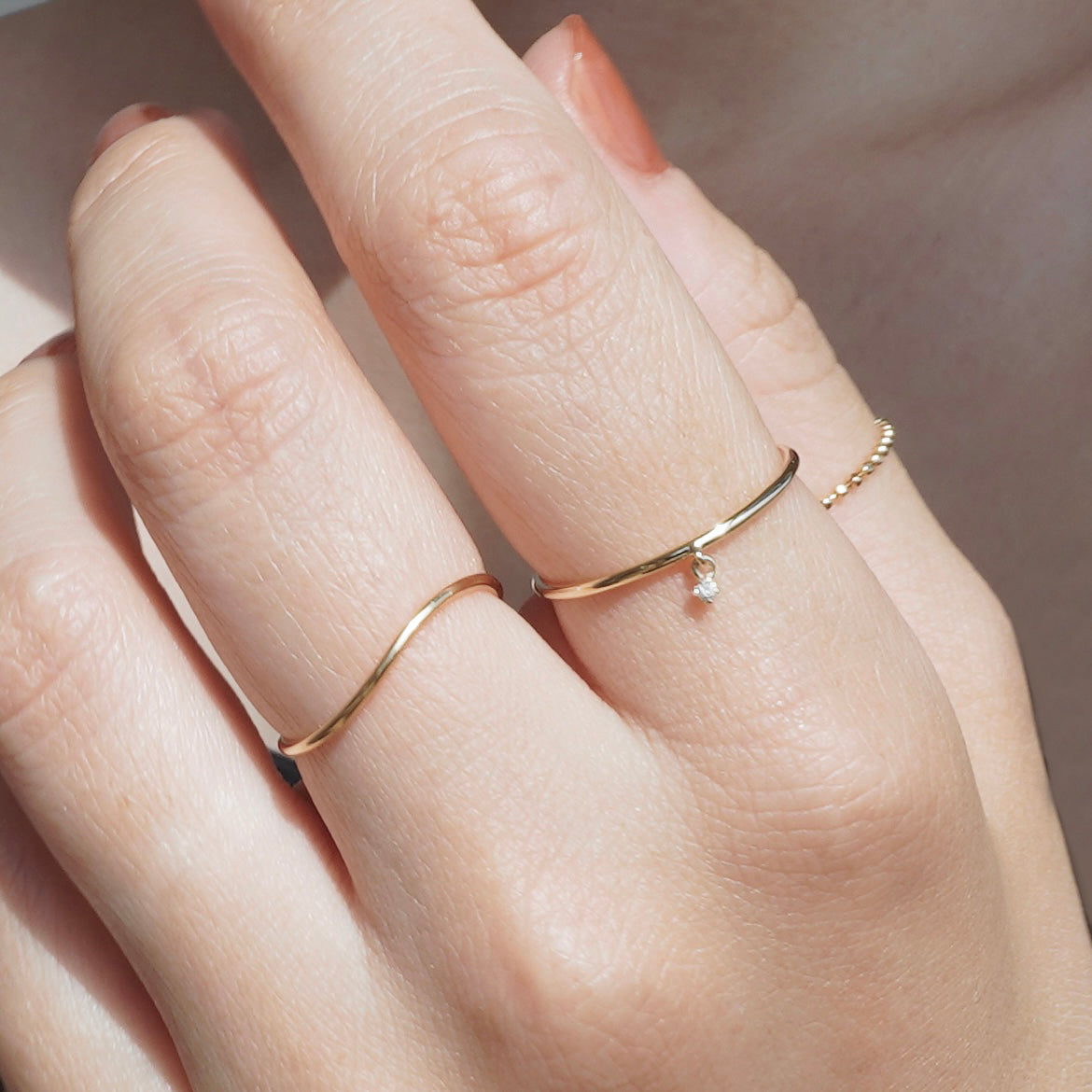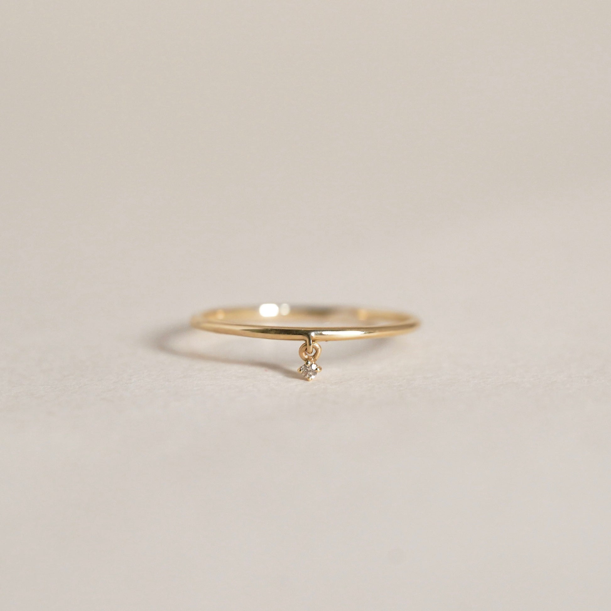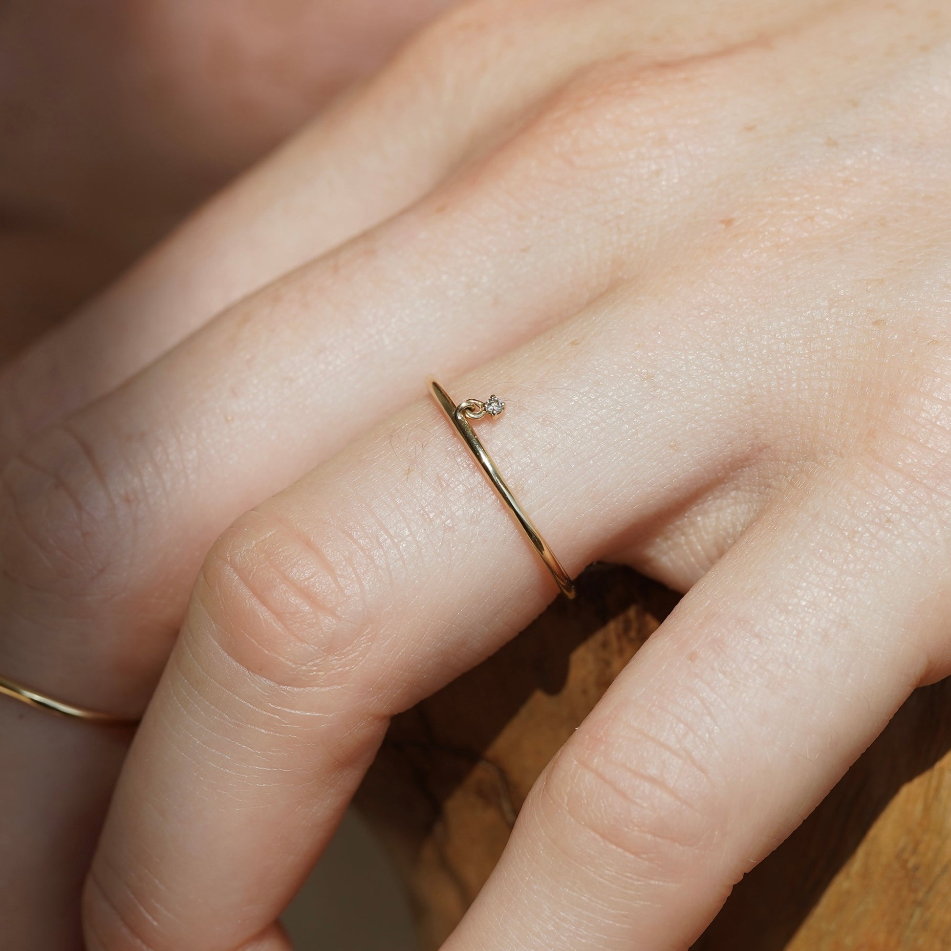 動くたびにダイヤモンドがきらきらと輝き、目に入るたびに心奪われるリングです。細やかにダイヤモンドが揺れるので繊細な雰囲気も◎
