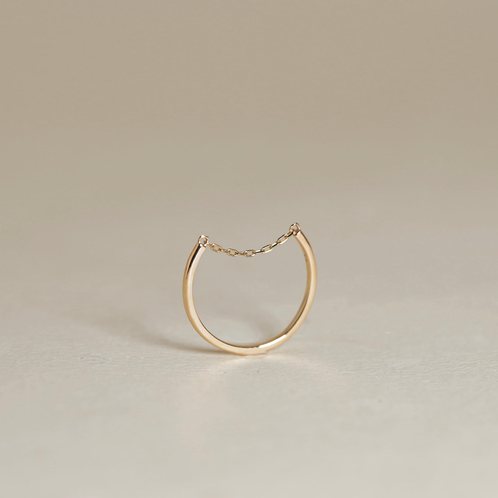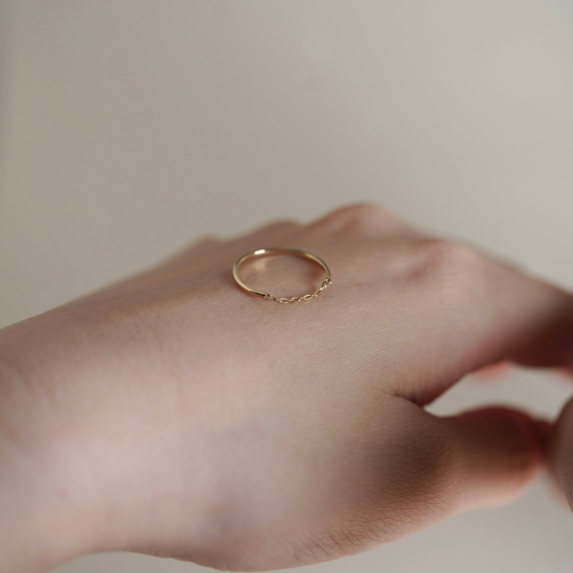 チェーンの細やかな動きが指先を華やかに演出し、繊細な印象を与えてくれます。着けたときにチェーンとリング部分が両方見えるようにこだわりました。